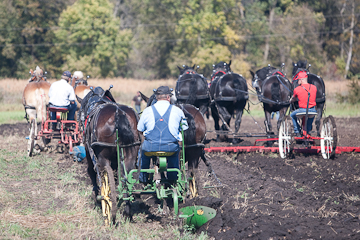 I got to watching again the DVD from Gene's field day and the picture of Steve Reulf on the plow with his spotted drafts sure stood out again for me. Steve when I think of all the possiblities of a wreck happening and just how easy it could be avoided. Steve and others should always sit on or otherwise secure the lines when driving. I use a simple conway buckle to secure my lines together then tie them in a loop and either hang them on a standard or on a handle on the plow. This way if I drop one, and yes it can happen, I don't worry where they are, I know and can find them fast and continue driving. When mowing I sit on them and the same goes for when I'm on a disc. My forcart has standards that once I tie the loop they can hang on the standard and I don't have to worry about the excess line falling downand being lost or run over. Folks please keep in mind that I am in no way picking on Steve, because he is a very good teamster. Its just a good way for someone to learn a safer method of controlling the lines.